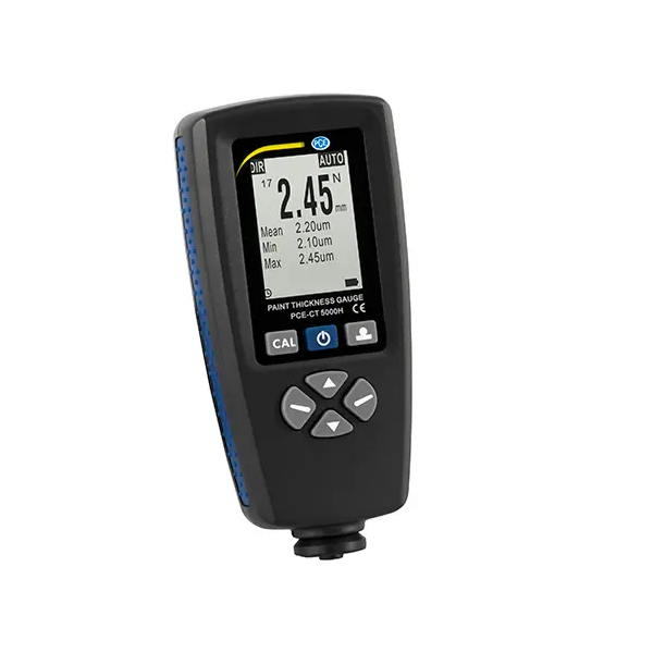 PCE-CT 5000H is a coating thickness measuring instrument used for the rapid determination of coating thicknesses on ferrous (Type F) and non-ferrous (Type N) metals. The coating thickness gauge automatically detects the type of metal to be measured. The PCE-CT 5000H coating thickness gauge uses magnetic induction (ferrous) or eddy current (non-ferrous) to take non-destructive measurements of coating and dry film thickness (DFT) on metal substrates such as steel and aluminum.