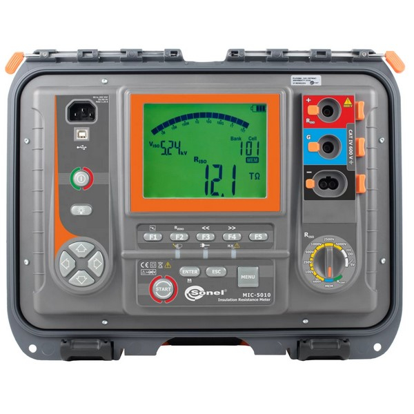 The Sonel MIC-5010 insulation resistance meter is a reliable tool for measuring insulation resistance up to 15 TΩ. The maximum measurement current is 1.2 mA or 3 mA, which guarantees the charging of an object with a large capacity in a short time. Each measurement, whether the programmed time expires or is manually interrupted, ends with the meter discharging the object. The device has unique algorithms that allow it to recognise the nature of the voltage present on the object, thanks to which the instrument can determine whether the voltage is the mains voltage - in which case the measurement will not be carried out - or whether it is the voltage generated by an electromagnetic field - in which case the measurement will be carried out. This makes it possible to carry out measurements in the presence of very strong electromagnetic fields where this was previously not feasible.